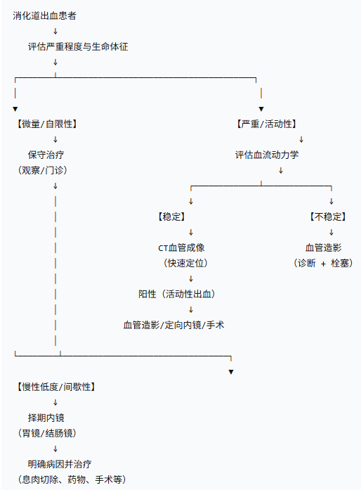 根据出血严重程度、血流动力学状态以及诊断时机来分层处理消化道出血的核心策略。